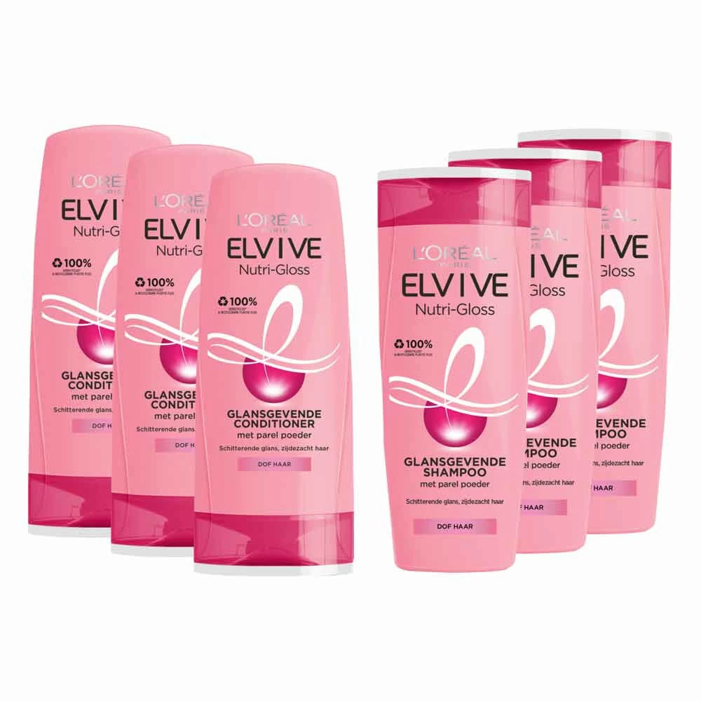Lu0027Oréal Elvive Nutri-Gloss PakketLu0027Oréal Elvive Nutri-Gloss ShampooHoe langer je haar is, hoe gevoeliger het wordt. Het haar kan na verloop van tijd dof worden: het heeft een gebrek aan glans, vitaliteit en zachtheid. Elvive Nutri-Gloss verrijkt met Proteïne en parel geeft een gelijkmatige voeding aan je haarvezel, zonder het te verzwaren en geeft je haar een ultieme glans: je haar vangt en reflecteert het licht optimaal. Het haar wordt schitterend glanzend en voelt
