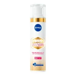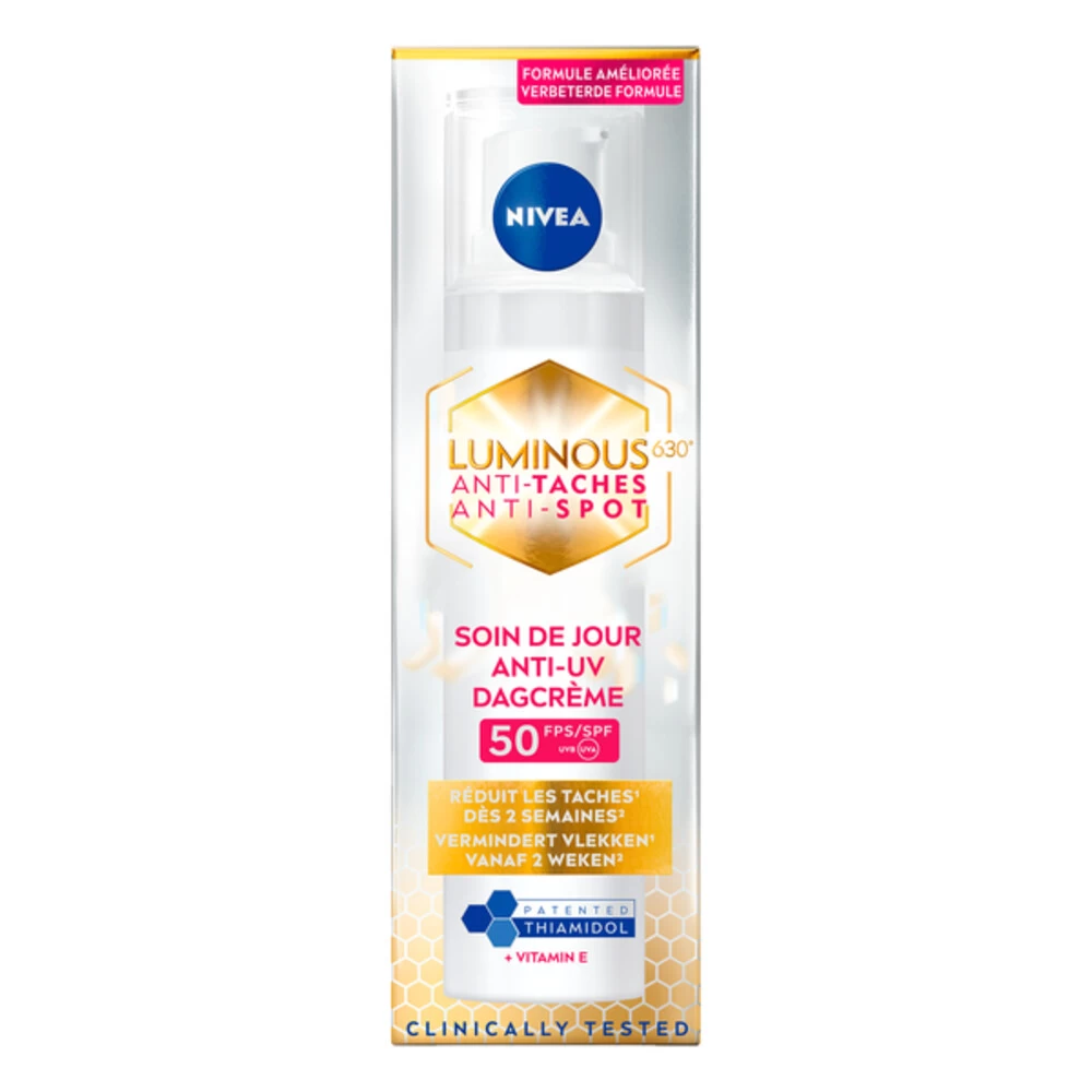 Nivea Cellular Luminous Anti-Pigment Fluid Cream SPF50Nivea Cellular Luminous630 Anti-Spot Dagcrème SPF50 combineert Luminous630 met hyaluronzuur, Vitamine E en UVA / UVB-filters voor een hoge bescherming. De formule beschermt de huid tegen zon en photo-aging en zorgt dat de huid gehydrateerd is, matter en gladder wordt. Nivea Cellular Luminous630 Anti-Spot Dagcrème met SPF50 vermindert zichtbaar pigMentvlekken en beschermd de huid om nieuwe te voorkoMen. Door het gebruik van de Lu